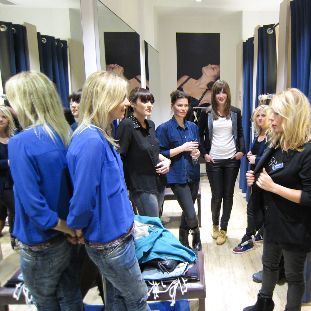 Anschließend halfen uns drei Visagisten dabei, das perfekte Outfit im Karstadt zusammen zustellen. Gar nicht so einfach, sich da zu entscheiden. Auf dem nächsten Bild trage ich mein Outfit, alles von Maje. Der Blazer gefiel mir am besten, der Preis ist aber auch nicht ohne – 400 €. Mein Oberteil ist auch von Maje, aus reiner Seide. Minuspunkt? Maje stellt keine Schuhe in meiner Größe her, ich lebe auf großem Fuß mit Schuhgröße 41. Es hört dort allerdings bei Größe 40 auf. Lena hat da Glück gehabt, sie ist noch größer als ich, hat aber Schuhgröße 39. Sie meinte aber ihre Freundinnen – vermutlich alles Models – hätten noch viel größere Füße. Beruhigend!