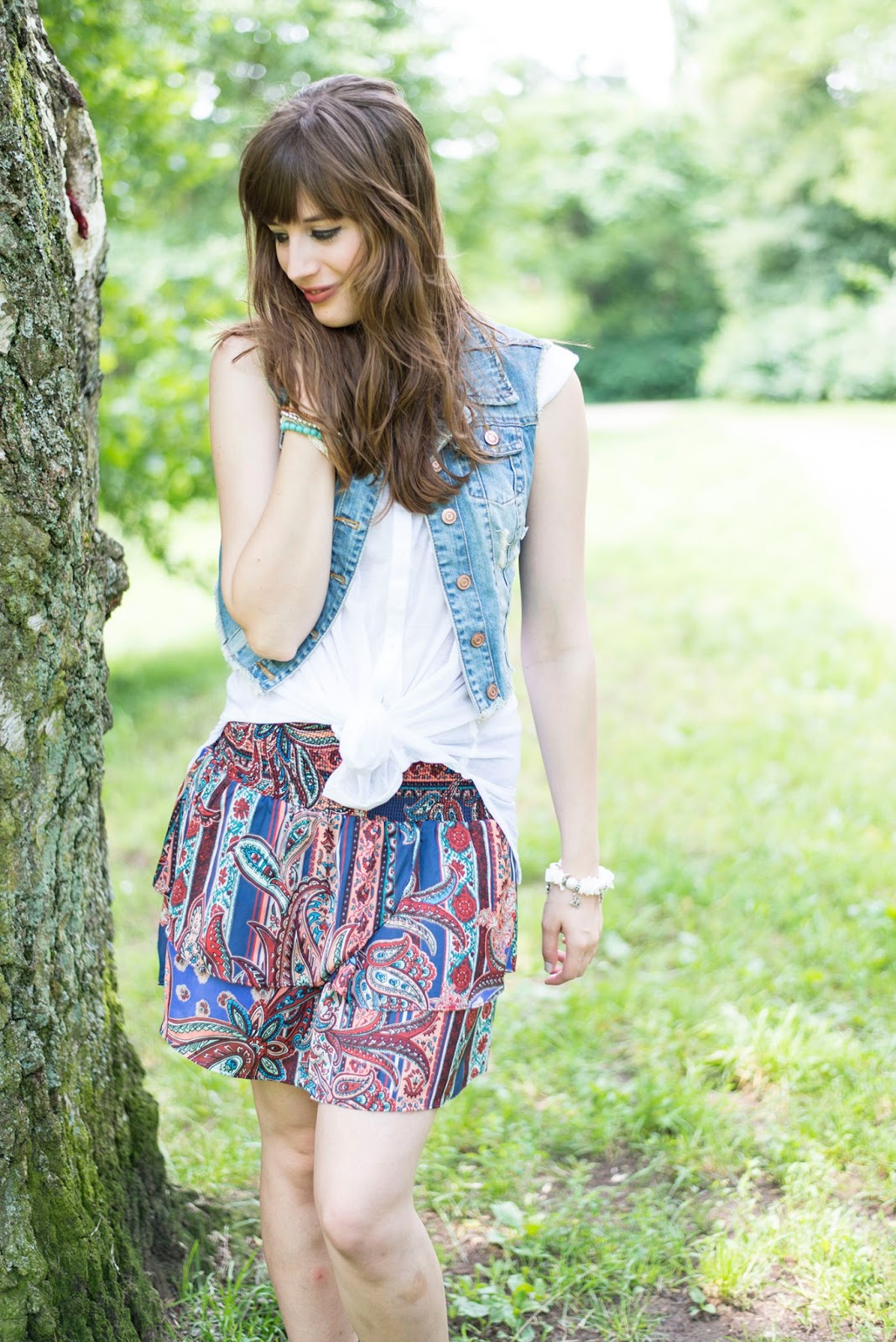 Mein Outfit des Tages passt zu solchen Sommertagen wie heute perfekt. Flatterrock, luftige Bluse und Jeansweste – perfekt zu Nachmittagen im Eiscafé, plauschen im Biergarten oder spazieren gehen am Tabaksweiher – da haben wir nämlich die Fotos gemacht. Leider auch das Mückenspray vergessen, ich reagiere sowas von allergisch auf Mückenstiche.