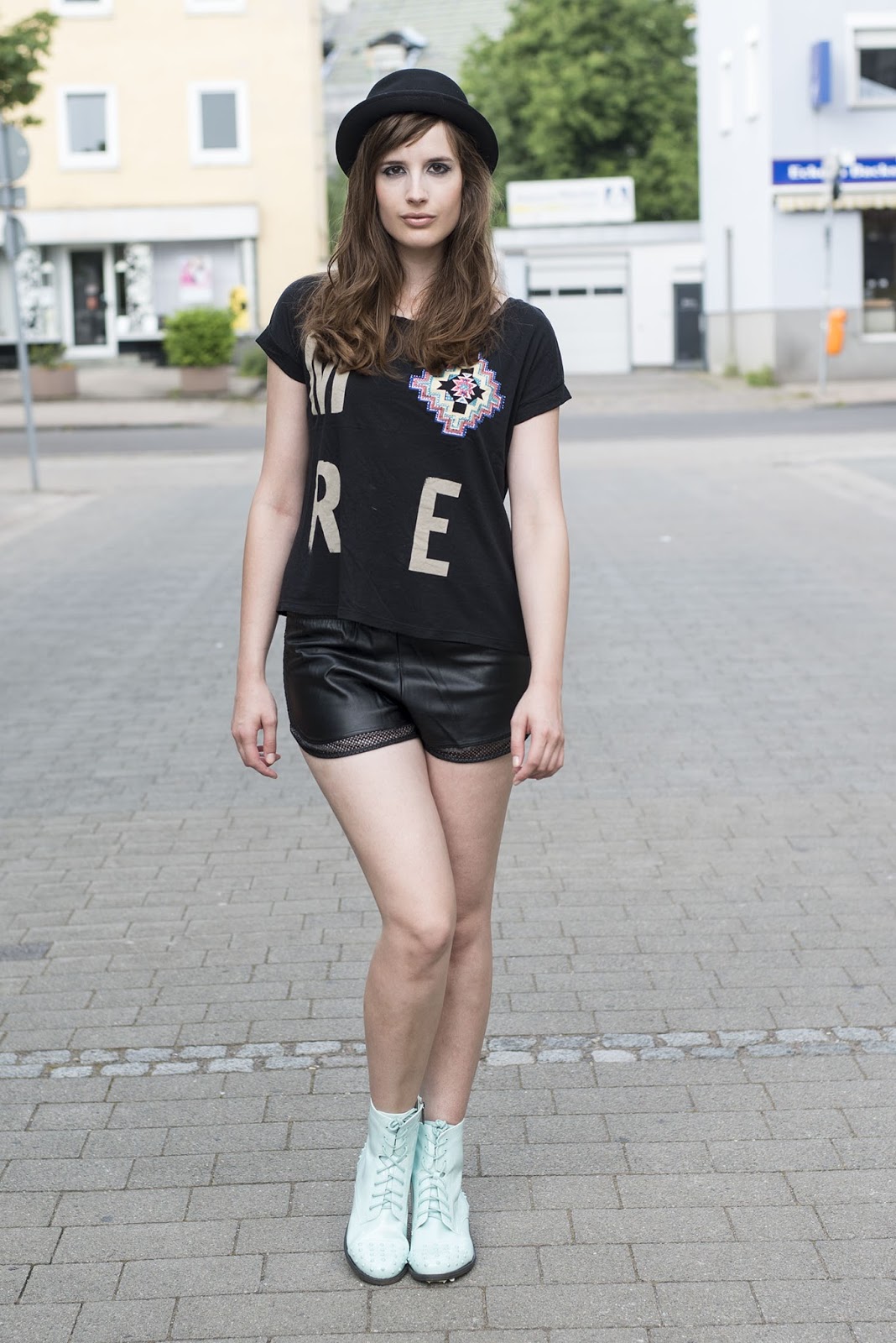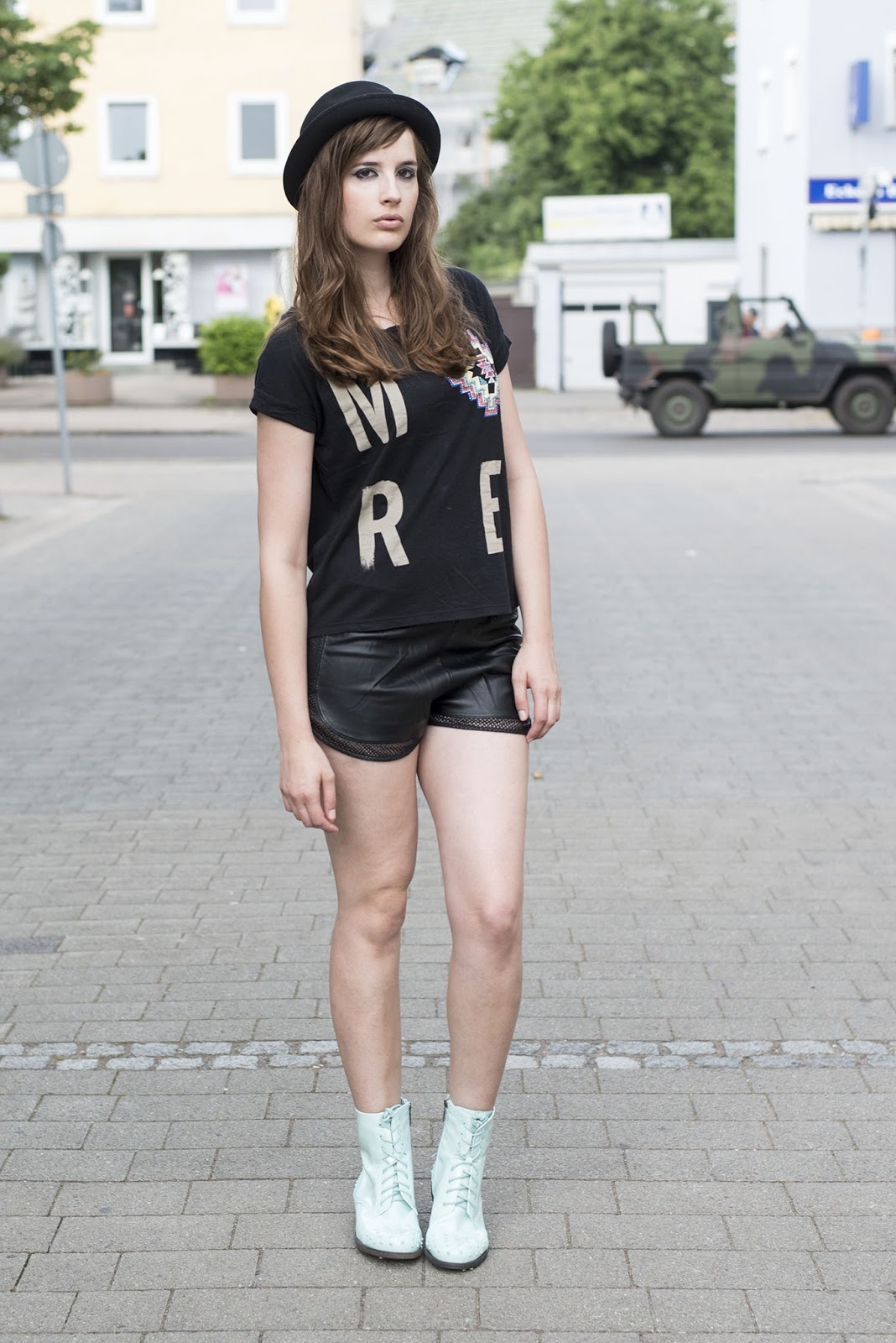 Shirt & Shorts: Bershka, Boots: Even & Odd, Hat: H&M
