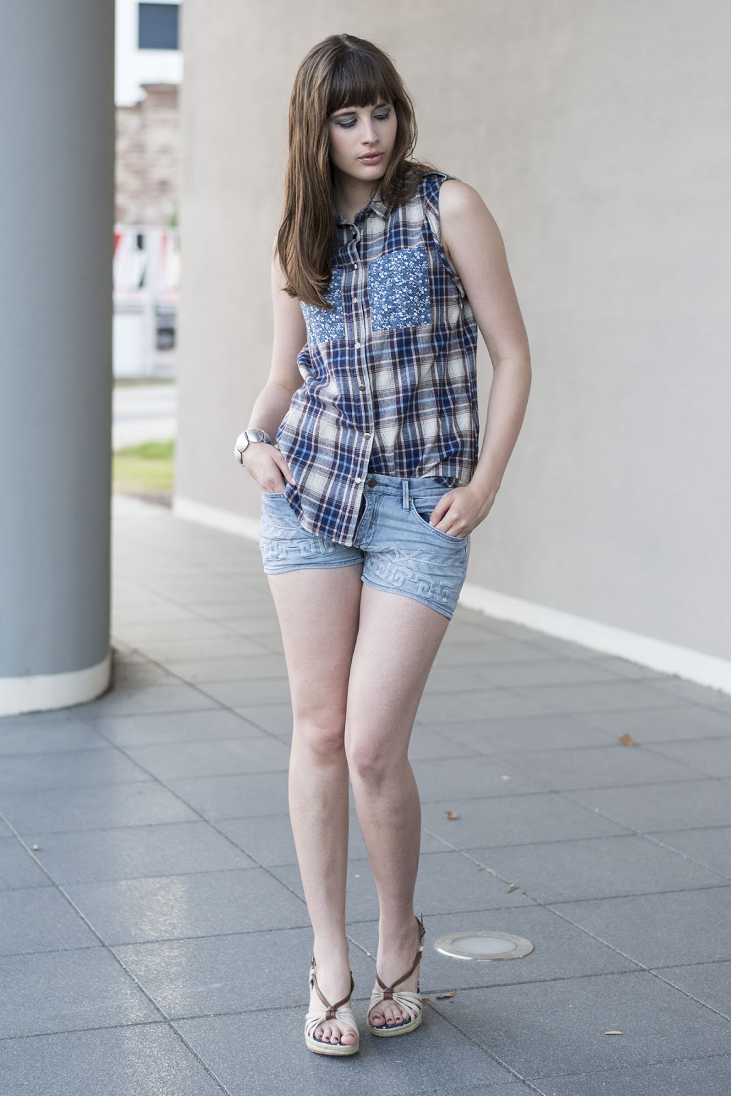 Ärmellose Bluse, Jeans-Shorts, Wedges – fertig ist der unkomplizierte Sommerlook. Meine Bluse ist von Asos und ich mag besonders die vielen schönen Details.