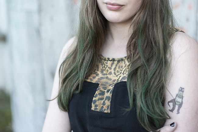 EN: I kind of feel like my evil twin with the green hair and all the tattoos. But actually, it’s about my leo crop top which is from the label Evil Twin. I really like their clothes a lot and I’m happy to show you some more outfits soon. The hair chalk was a bit stressful because it took me some time to colour my hair. The effect isn’t very strong, but my hair is maybe a bit too dark for this colour.