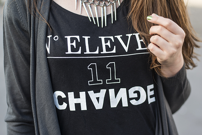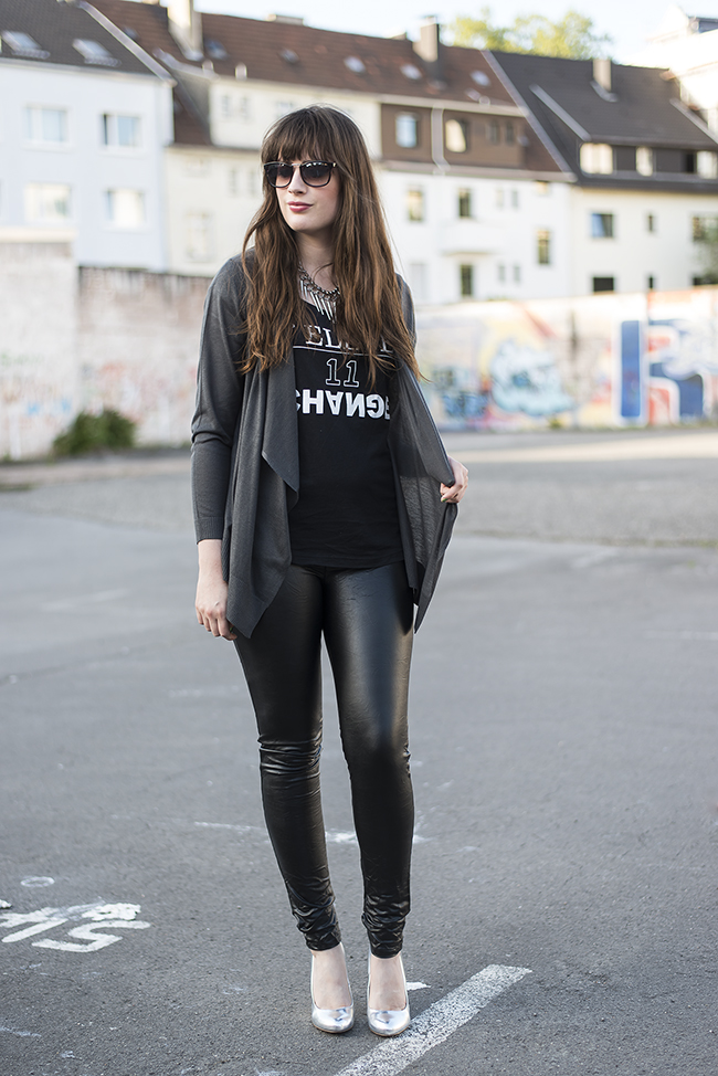 Yangkyi hat für mich den Cardigan, die Lederleggings und das Shirt zusammengestellt und damit genau meinen Geschmack getroffen. In der Beschreibung zum Outfit empfiehlt sie dazu High Heels in einer Signalfarbe (habe ich nicht, dafür aber Metallic Heels) und eine Statementkette als Accessoire.