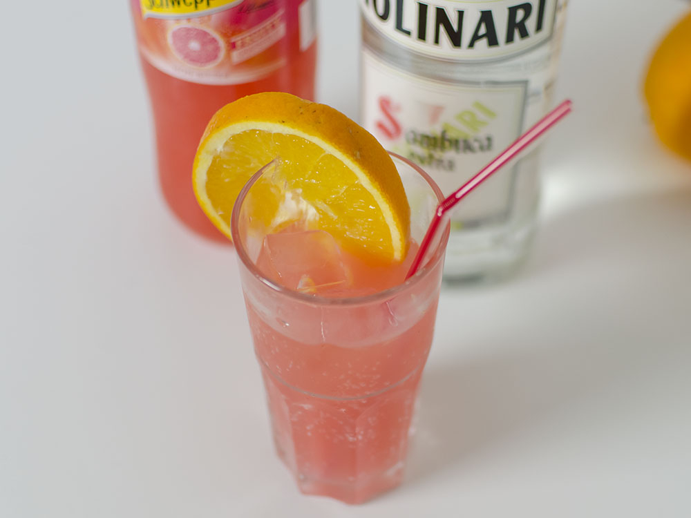 mit einer Spirituose, Filler (Saft oder Soda) plus Eiswürfel. Mein
