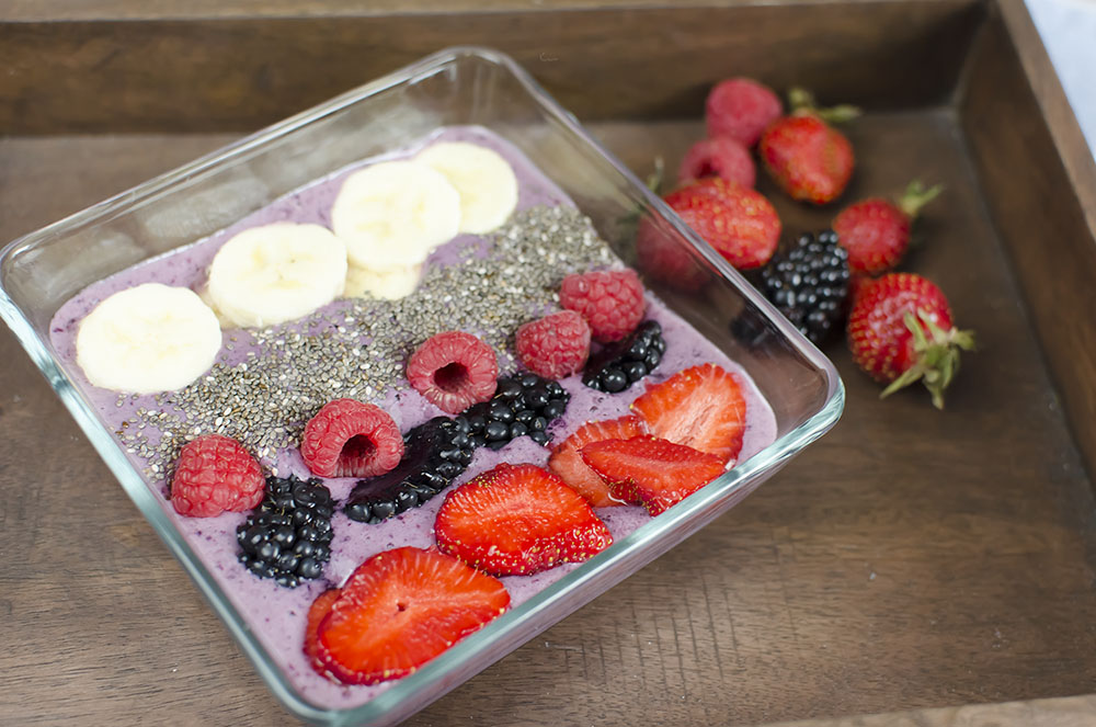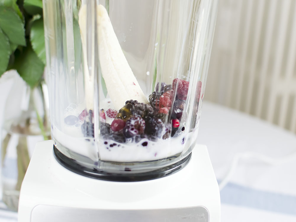 Die Grundlage ist der Smoothie: Hierfür habe ich 1 Banane, 1 Tasse gefrorene Beerenmischung, 1 Tasse Milch und etwas Honig im Mixer püriert. Der Smoothie ist dann etwas dickflüssiger, also weniger zum Trinken und mehr zum Essen. So kann man ihn ganz einfach in eine Schüssel geben.