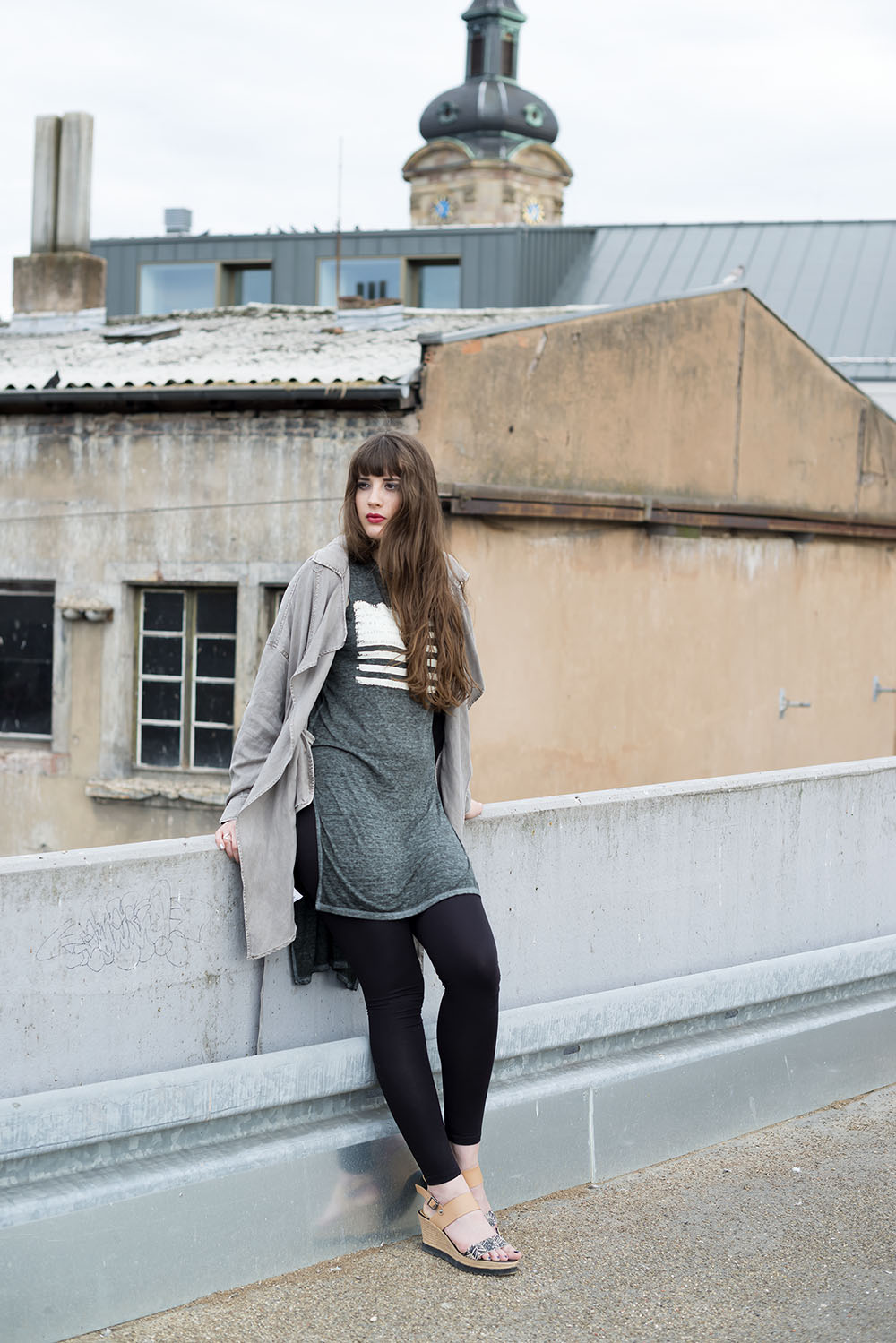 EN: It isn’t even August and the fashion industry is all about autumn clothing. I’ll never get used to it! My outfit is a little crazy, like the weather right now – but I enjoy the cooler days before the next summer episode next week: Hippie sandals, long leggings, t-shirt dress and trench coat.