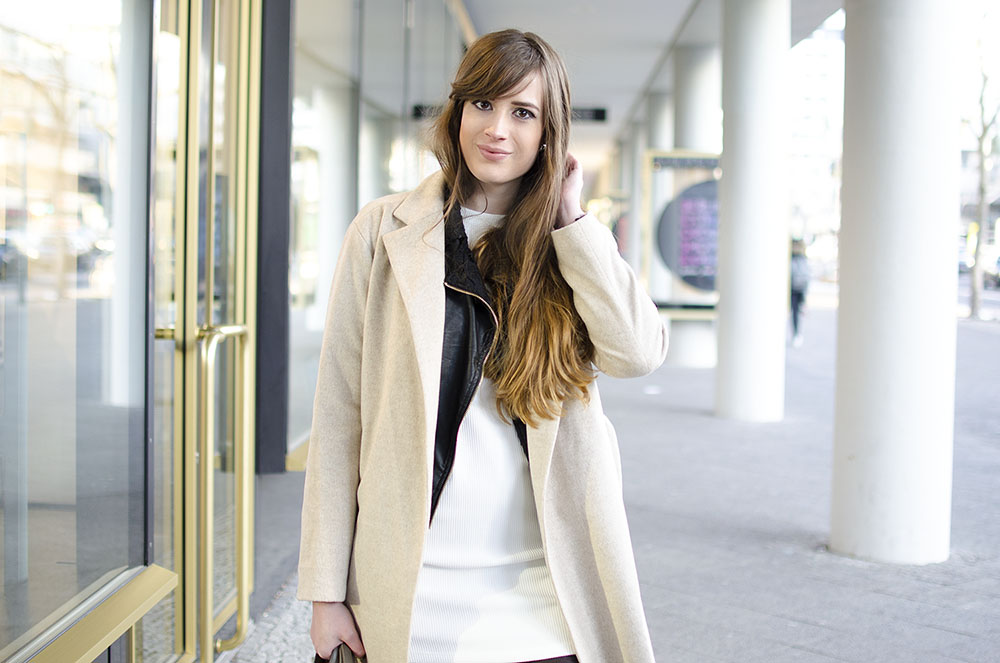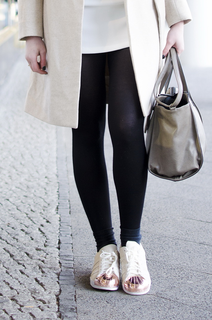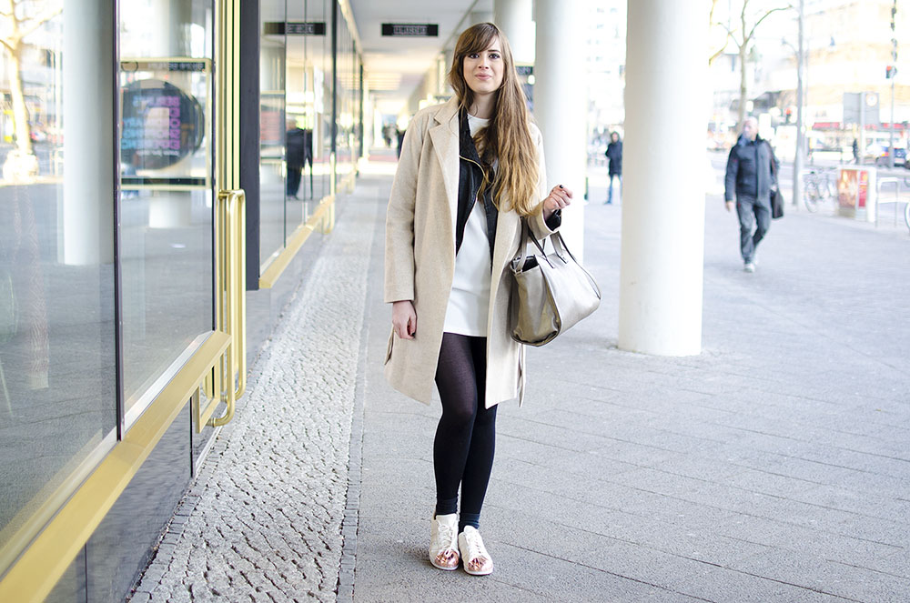 EN: This week is all about the Berlin Fashion Week! I will post all week about fashion and make-up trends, my outfits and everything else that happened last week. My outfit on day 1: Layering with leather jacket and wrap coat, a basic white t-shirt dress and the adidas superstar metal toe sneakers. I tried to find outfits matching with my three pair of comfy shoes which you can mix and match with many looks.